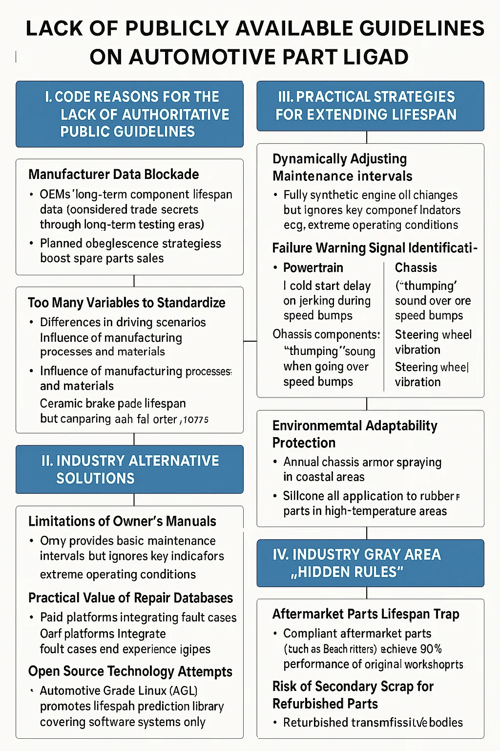 ในอุตสาหกรรมการซ่อมแซมยานยนต์ ไม่มีแนวทางปฏิบัติเดียวที่เปิดเผยต่อสาธารณะที่ครอบคลุมอายุการใช้งานของทั้งหมดอย่างครอบคลุม ชิ้นส่วนยานยนต์ . สถานการณ์นี้เกิดจากความซับซ้อนของอุตสาหกรรมและอิทธิพลของตัวแปรหลายตัว ต่อไปนี้คือการวิเคราะห์ที่สำคัญของปัจจัยเหล่านี้:
