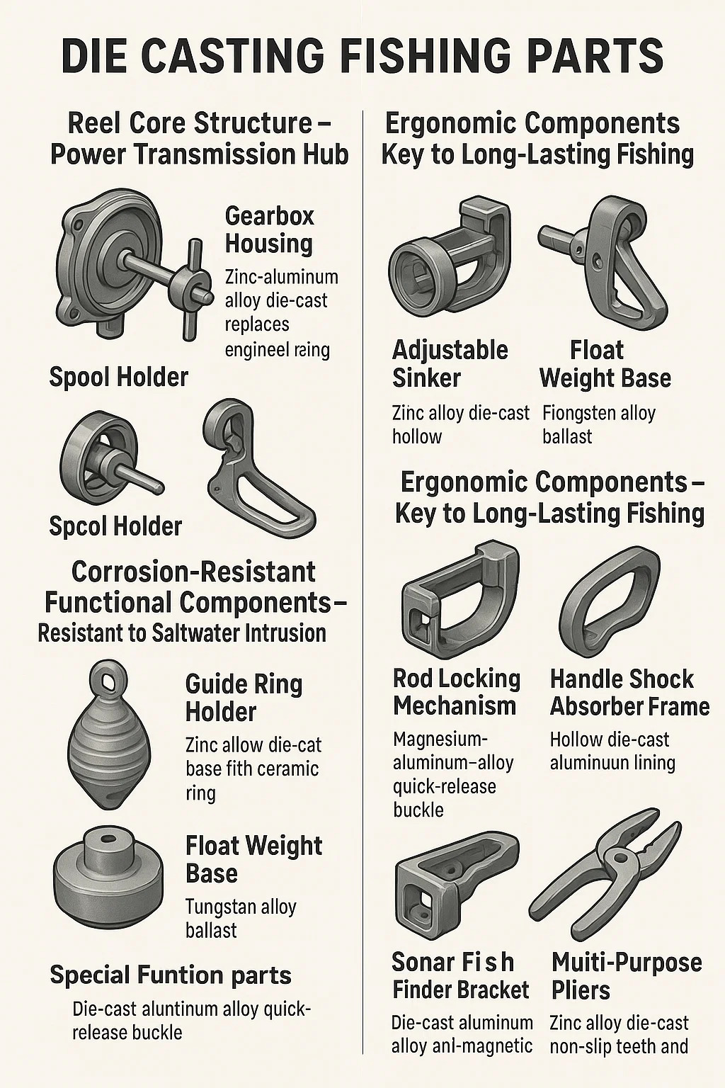 ชิ้นส่วนตกปลาหล่อตาย เป็นส่วนประกอบโลหะหลักที่ผลิตโดยใช้กระบวนการหล่อแรงดันสูง พวกเขาจัดการกับข้อกำหนดการจับปลาที่สำคัญเช่นน้ำหนักเบาความต้านทานการกัดกร่อนและความน่าเชื่อถือในการใช้งาน แอปพลิเคชันและคุณสมบัติที่สำคัญมีดังนี้: