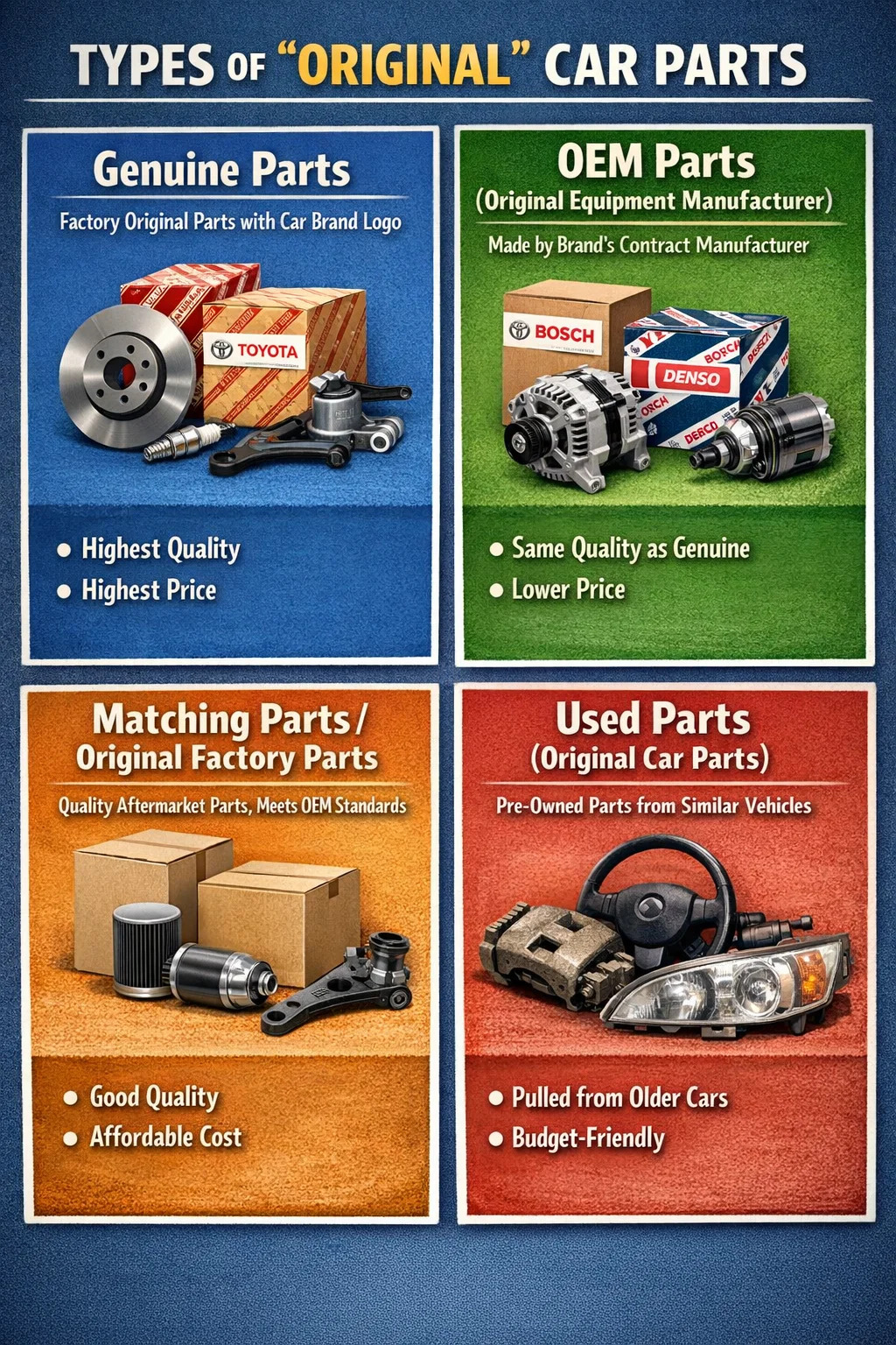 เมื่อผู้คนพูดถึงอะไหล่รถยนต์ "ดั้งเดิม" จริงๆ แล้วมีคำศัพท์ที่แตกต่างกันหลายคำ แม้ว่าคำเหล่านี้จะฟังดูคล้ายกัน แต่ในปากของช่างเครื่องหรือเจ้าของร้านอะไหล่รถยนต์ คำที่ต่างกันเหล่านี้มักจะแสดงถึงจุดราคาและที่มาของคำเหล่านี้ที่แตกต่างกัน อะไหล่รถยนต์ .
