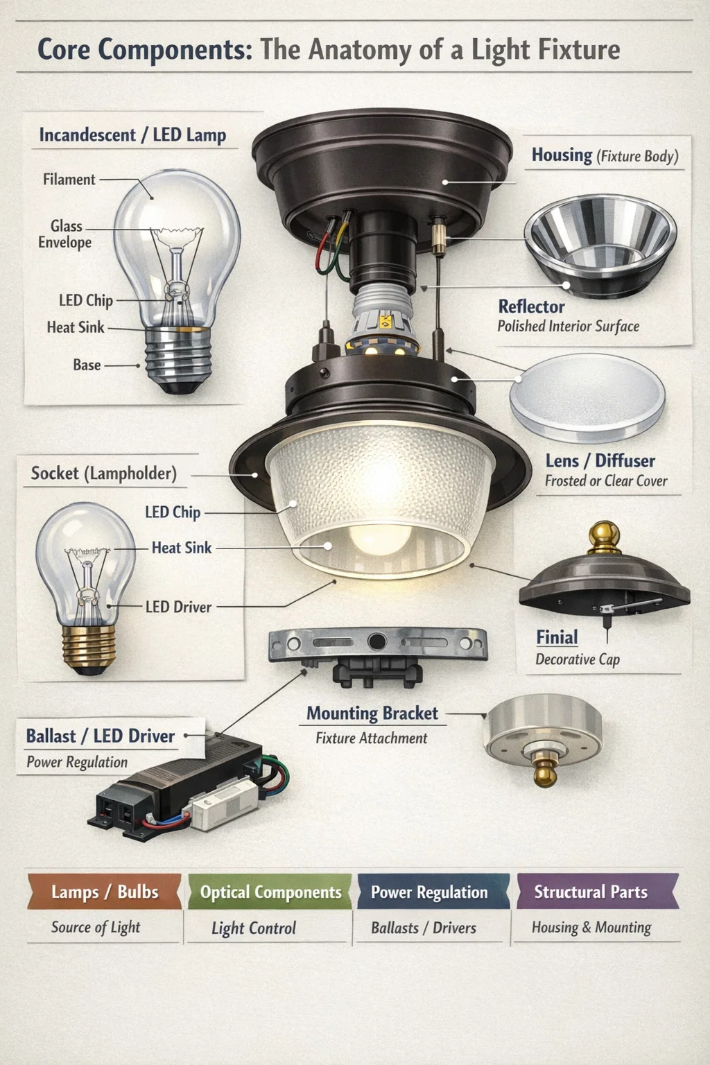โคมไฟซึ่งมักเรียกในทางเทคนิคว่าโคมไฟนั้นประกอบด้วยองค์ประกอบที่แตกต่างกันหลายประการ ชิ้นส่วนไฟ ที่ทำงานประสานกันเพื่อให้แสงสว่าง ส่วนพื้นฐานที่สุด ได้แก่ โคมไฟ (หลอดไฟ) , ที่ ซ็อกเก็ต , ที่ ตัวเรือน (ตัวติดตั้ง) และ เลนส์หรือตัวกระจายแสง . ในขณะที่หลอดไฟสร้างแสงสว่าง ส่วนประกอบอื่นๆ มีหน้าที่ยึดหลอดไฟให้อยู่กับที่ ปกป้องหลอดไฟ และกำหนดทิศทางลำแสงไปยังพื้นที่ที่ต้องการ