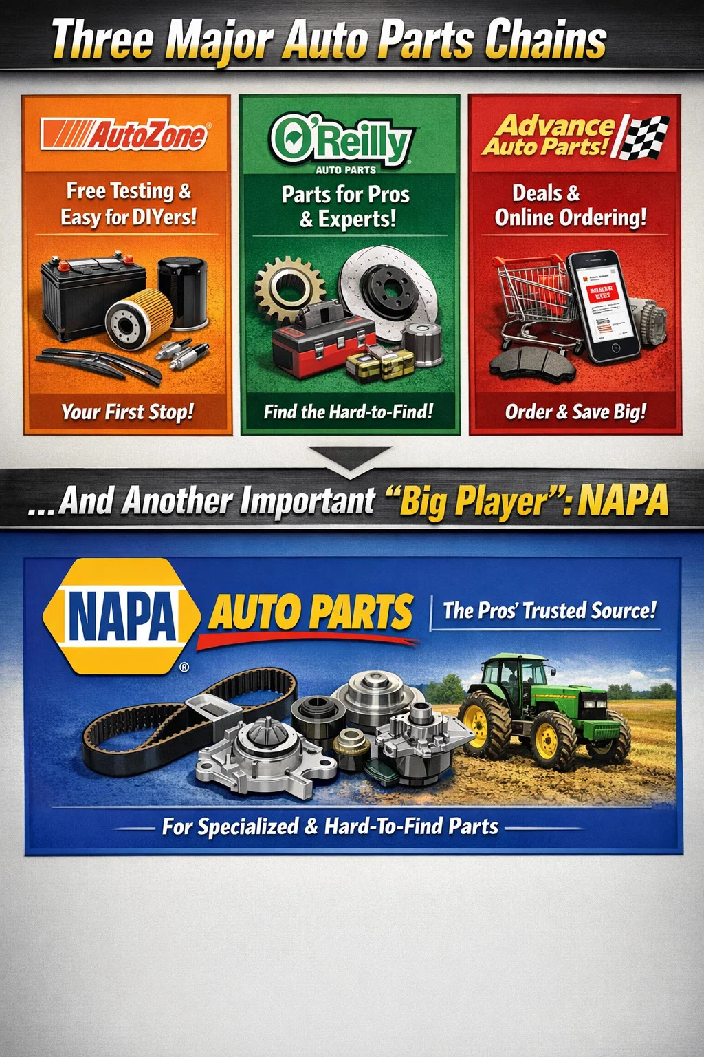 แม้ว่าทั้งสามสิ่งที่กล่าวมาข้างต้นมักเรียกกันว่า "สามยักษ์ใหญ่" แต่ NAPA Auto Parts ก็มีความสำคัญอย่างยิ่งเช่นกัน ให้บริการช่างซ่อมมืออาชีพและตลาดเครื่องจักรกลการเกษตรเป็นหลัก หากคุณไม่พบอะไหล่รถยนต์เฉพาะทางที่ "สามยักษ์ใหญ่" NAPA มักจะคือความหวังสุดท้าย