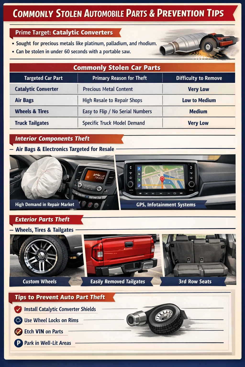 โจรมักมุ่งความสนใจไปที่ ชิ้นส่วนรถยนต์ ที่ลบง่ายและติดตามยาก ตารางต่อไปนี้เน้นเป้าหมายที่พบบ่อยที่สุดและสาเหตุที่ถูกขโมย